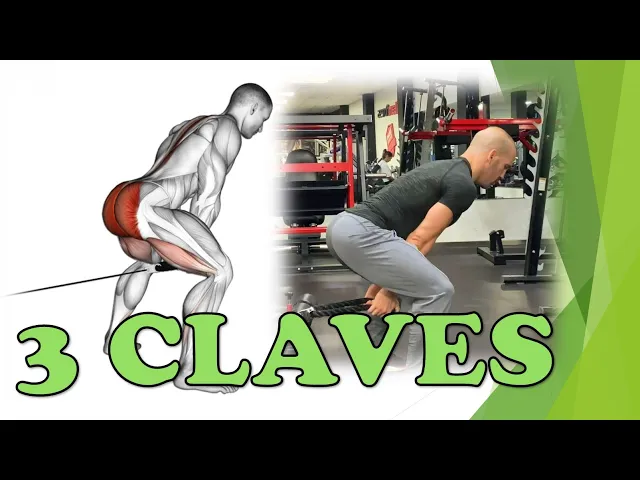 Se usa un cable en una máquina para realizar un movimiento de extensión de cadera, activando los glúteos y isquiotibiales.